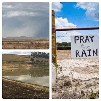 Als wir selbst durch das Hinterland gefahren sind waren wir erschüttert von den leeren Dämmen und Wasserspeichern, ein trostloses Bild, bei dem einem Endzeit Gedanken kommen. Wenn die Dämme auf unter 10% fallen, werden die Wasserhähne abgedreht!