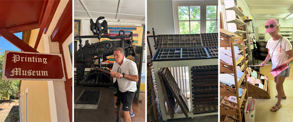 Wir suchten Schutz vor der Sonne und stießen auf die geschlossenen Türen der Kirche. Weiter ging es, bis wir auf ein offenes Gebäude trafen: ein kleines Druckmuseum. Hier fanden sich Druckmaschinen aus verschiedenen Epochen, von handbetriebenen Pressen bis hin zu frühen mechanischen Modellen. Direkt daneben ein Apothekenmuseum und allerlei Kuriositäten, liebevoll arrangiert, aber scheinbar seit Jahrzehnten unberührt.