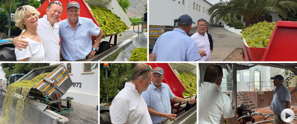 Als wir im Weinberg ankamen standen schon zwei Vollernter bereit, um uns mit auf eine kleine Reise zu nehmen, die wir so schnell nicht vergessen werden. Das sind wirklich Riesenteile, die da in der Landschaft stehen. Einmal oben hat man einen ganz anderen Ausblick und sieht, wie groß die Fläche tatsächlich ist und man versteht, weshalb es gleich zwei dieser Monster braucht um das in sinnvoller Zeit abzuernten. Dann gings auch schon los und wir trauten unseren Augen nicht wie fix das ging und wie sanft die Trauben von den Rebstöcken geschüttelt und eben nicht gerissen wurden. Fast noch unglaublicher war hinter bzw. unter uns das weitestgehend unversehrte Lesegut zu sehen, dass die Maschine schon weitestgehend entrappt auf ein Förderband spuckte, ehe es noch einmal durch eine integrierte Entrappungsmaschine in den Tank im Bauch der Maschine fiel. Noch ehe wir uns versahen, war die Reihe erledigt, das Monster wendet und weiter geht’s. Nur wenige Minuten nach dem Start standen wir fast wieder am Ausgangspunkt und unser Ernteeinsatz war beendet. Nur aber um dann wieder vom Boden den nächsten Schritt des Prozesses zu erleben. Während wir nämlich abstiegen, bezogen schon kleine Trekker mit Anhängern Stellung hinter den Monstern die dann sofort zu neuem Leben erwachten um in weniger als einer Minute Ihr Innerstes nach Außen zu stülpen und die Trauben in die Behälter zu entleeren um dann gleich ihre gefräßige Fahrt fortzusetzen. Währenddessen machen sich die Trekker mit dem nur wenige Minuten alten Lesegut auf zum Keller, wo die Kollegen sie schon erwarteten. Die Geschwindigkeit mit der all das wie ein Uhrwerk abläuft ist tatsächlich schwindelerregend und gibt den Trauben tatsächlich kaum Zeit das zu tun wovor Weinmacher sich am meisten fürchten nämlich zu oxidieren.