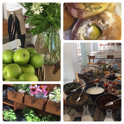 Die Speisekarte wird vom Angebot im Garten geleitet und spiegelt immer die Jahreszeit wider. Im Sommer biegt sich das Farm Frühstücksbuffet unter dem frischen Obst und Gemüse, das aus dem 3,5 ha großen Garten geerntet wurde. Duftende Pfirsiche, goldgelbe Aprikosen und Pflaumen, süsse Erdbeeren, knackige Äpfel, weiße und rote Tafeltrauben, unterschiedlichste Melonensorten, bunte Beeren, knallrote Granatäpfel, betörende Passionsfrüchte, Ananas, krachende Stachelbeeren und Obst, das uns als Mitteleuropäer noch nie untergekommen ist. Trockenfrüchte, eingelegte Kürbisse, frische Oliven und das dazugehörige, eigene Öl. Tomaten und Tomatillos, Artischocken und verschiedene Körner, frisch geröstetes Müsli, Käse aus der eigenen Käserei, sowie Bilton, Salami und Schinken vom eigenen Metzger. Die Säfte zieren das Buffet in den drei Ampelfarben. Natürlich wurden auch die Eier, für die diversen Eierspeisen, morgens frisch von den frei laufenden bunten Mistkratzern eingesammelt. Frische Pestos aus unterschiedlichen Kräutern.