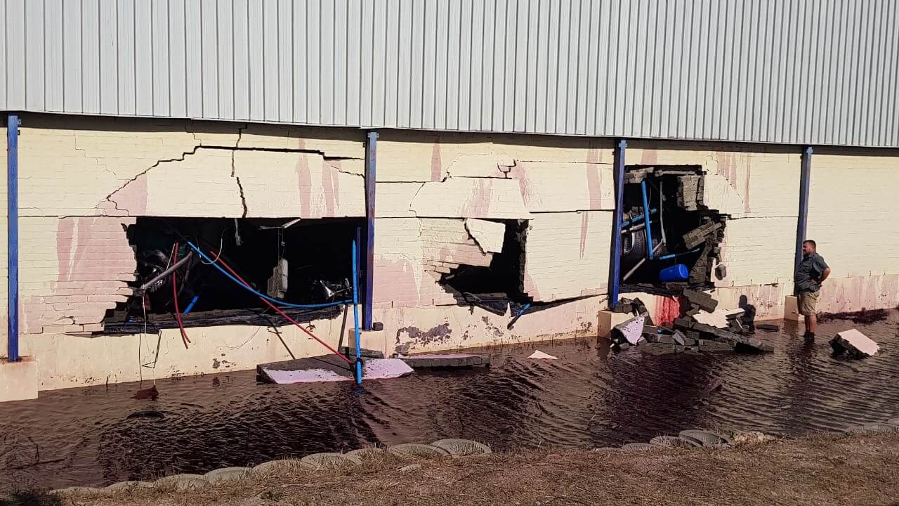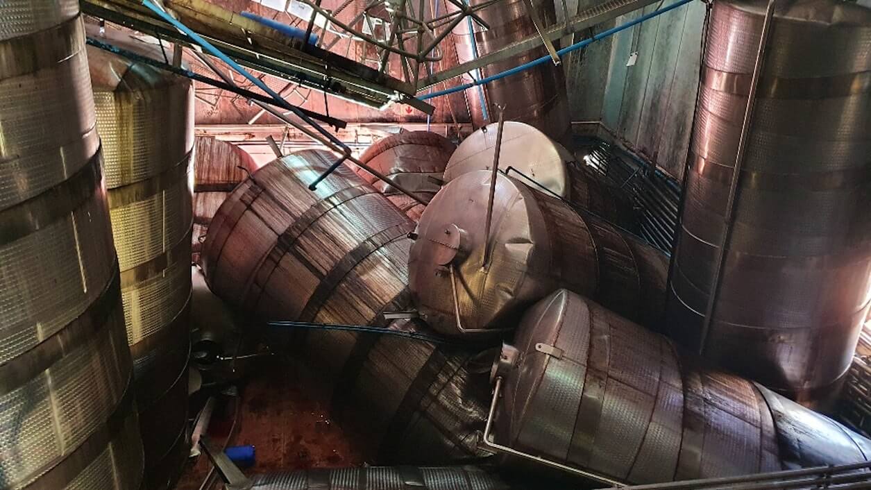 Die Kettenreaktion begann wahrscheinlich, als der Ständer, der einen der 50.000-Liter-Stahltanks trug, zusammenbrach, wodurch der erste Tank einen benachbarten Tank umwarf, der einen weiteren benachbarten Tank umwarf,…der Supergau für ein Weingut.  Einige der Tanks schlugen auch durch die Betonwände des Weinguts und beschädigten Rohre.