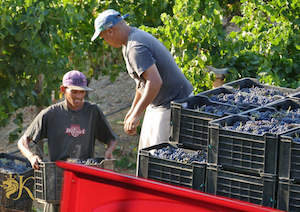 Auch bei uns in Südafrika erlebten wir einen sehr heißen Sommer mit einzelnen Tagestemperaturen um die 40 Grad. Die Merlottrauben konnten schon anfangs Februar geerntet werden, zwei Wochen früher als normal. An einem Erntetag erscheinen ca. 50 Arbeiter und das am frühen Morgen, wenn die Luft noch frisch und kühl ist. Im Weinberg wirds lebendig und aus allen Richtungen ertönen fröhliche Stimmen und Geplauder. Der Vorarbeiter organisiert die Ernte, indem er den Leuten systematisch Gebiete und Reihen zuteilt. Schon bald hört man das ununterbrochene Klipsen der Rebscheren. In wenigen Minuten sind die ersten 20kg Harassen voller sauberer Trauben. Diese werden von den Trägern aus dem Weinberg zum Anhänger geschleppt und in 500 kg Behälter gekippt.