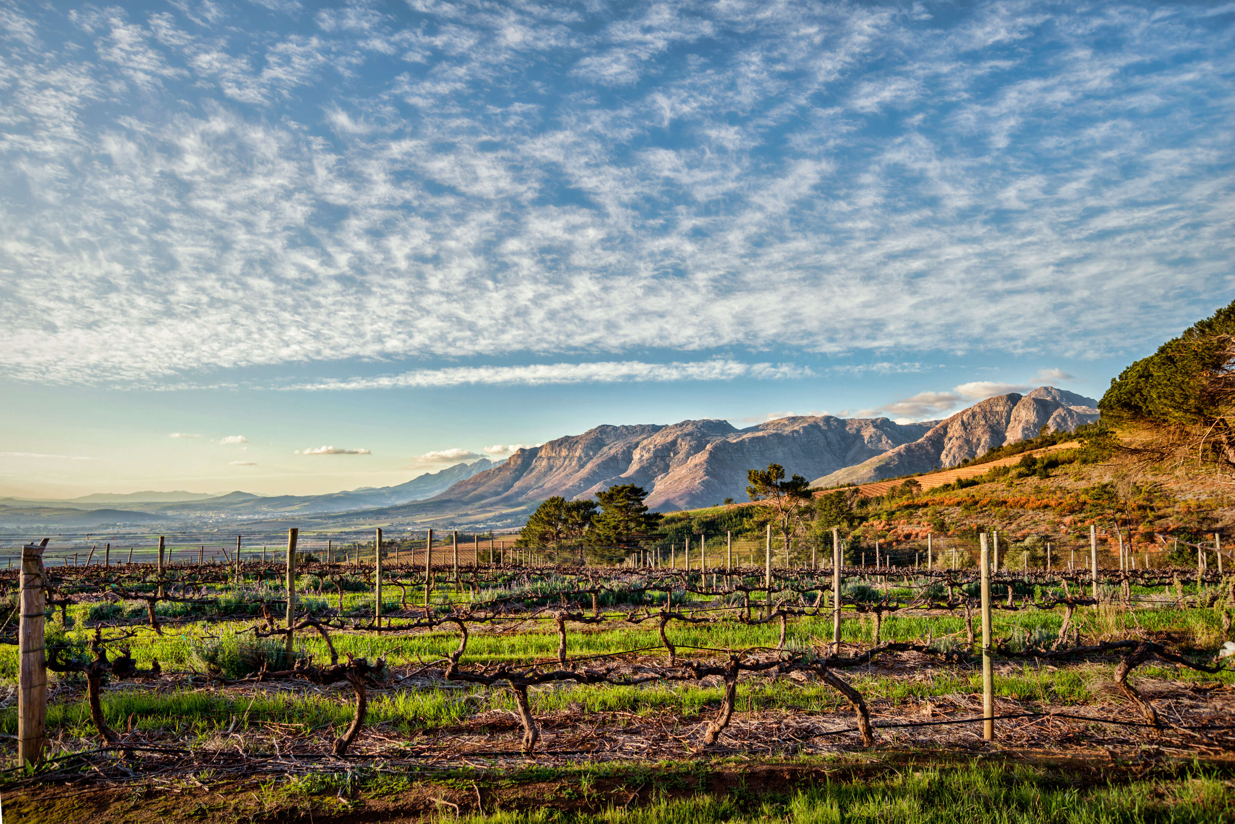 Auf der anderen Seite des Tals ist ein Hang mit Pfählen übersät, der sich erst aus der Nähe als ein Weinberg entpuppt, der Stok-by-Paaltjie (auch als Échalas oder Pfahlreben bekannt) mit Syrah bepflanzt ist. Diese steilen Hänge würden auch in der nördlichen Rhône nicht fehl am Platz wirken. Weiter unten, neben der Kellerei von Uva Mira, erstrecken sich die mit Spalieren bepflanzten Weinberge entlang eines sanft gewellten Hangs. Die sauberen Reihen werden nur von einem stattlichen Kerzenholzbaum unterbrochen, der zum Markenzeichen dieses feinen Weinguts in Stellenbosch geworden ist.