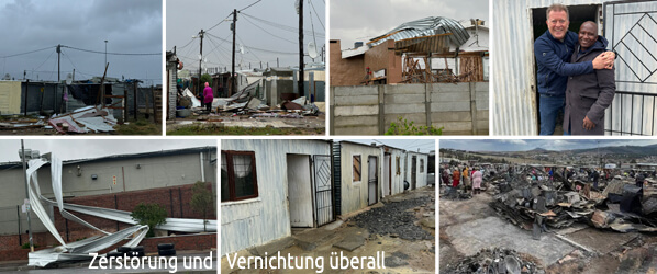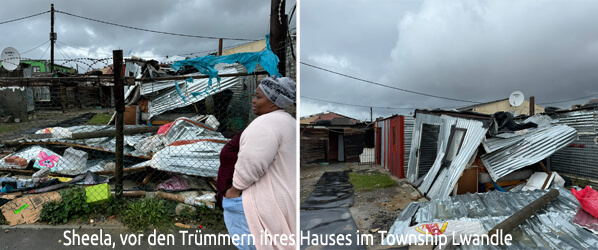 All das sind nun aber Schäden im paradiesischen Teil des Landes. Nochmal deutlich bedrohlicher müssen Millionen von Menschen diesen Sturm in den Townships oder auf der Strasse erlebt haben. Hier nur zwei exemplarische Beispiele von Menschen die uns nahe sind. Beim einen landete der windig errichtete erste Stock des Nachbarn in der Küche seiner Schwester. Dach kaputt, Küche kaputt, alles überflutet, Versicherung leider keine. Und Themba der Trainer des Fußballvereins den wir mit Lebenslinien e.V. unterstützen verbrachte weite Teile der Nacht auf dem undichten Dach seiner Blechhütte um zu verhindern, dass seine Frau auf den 5qm darunter mit einem Mal im freien sitzt. Die Kinder hatten sie ein Glück schon tags zuvor in Sicherheit gebracht.